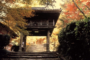 参道から見上げる楼門は紅葉に囲まれて美しく鮮やかです。